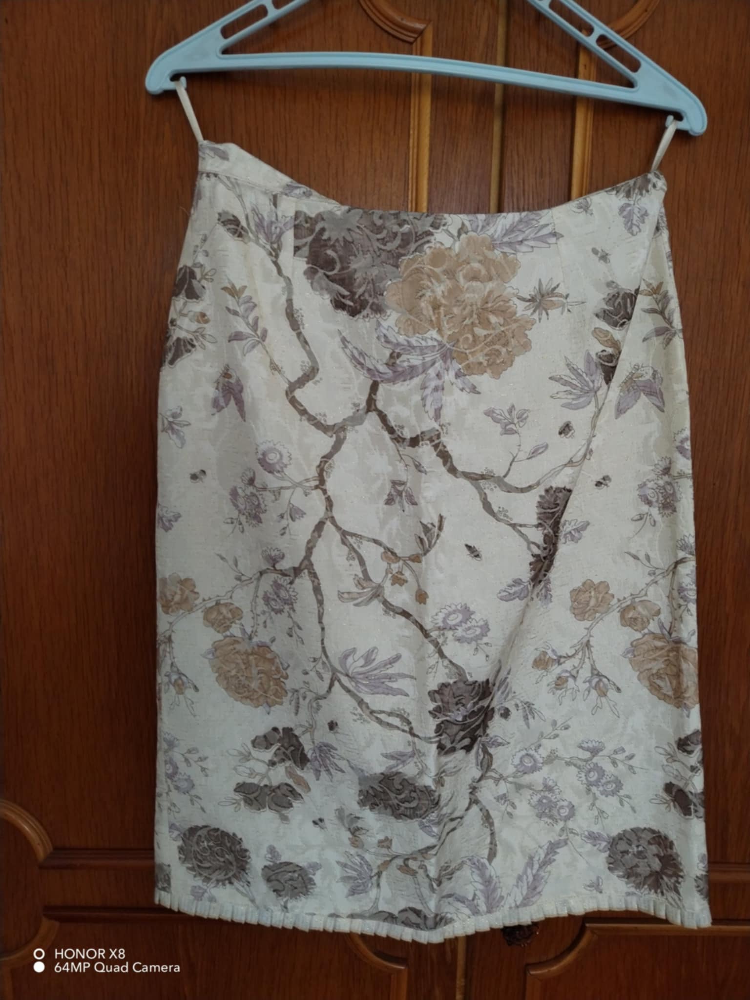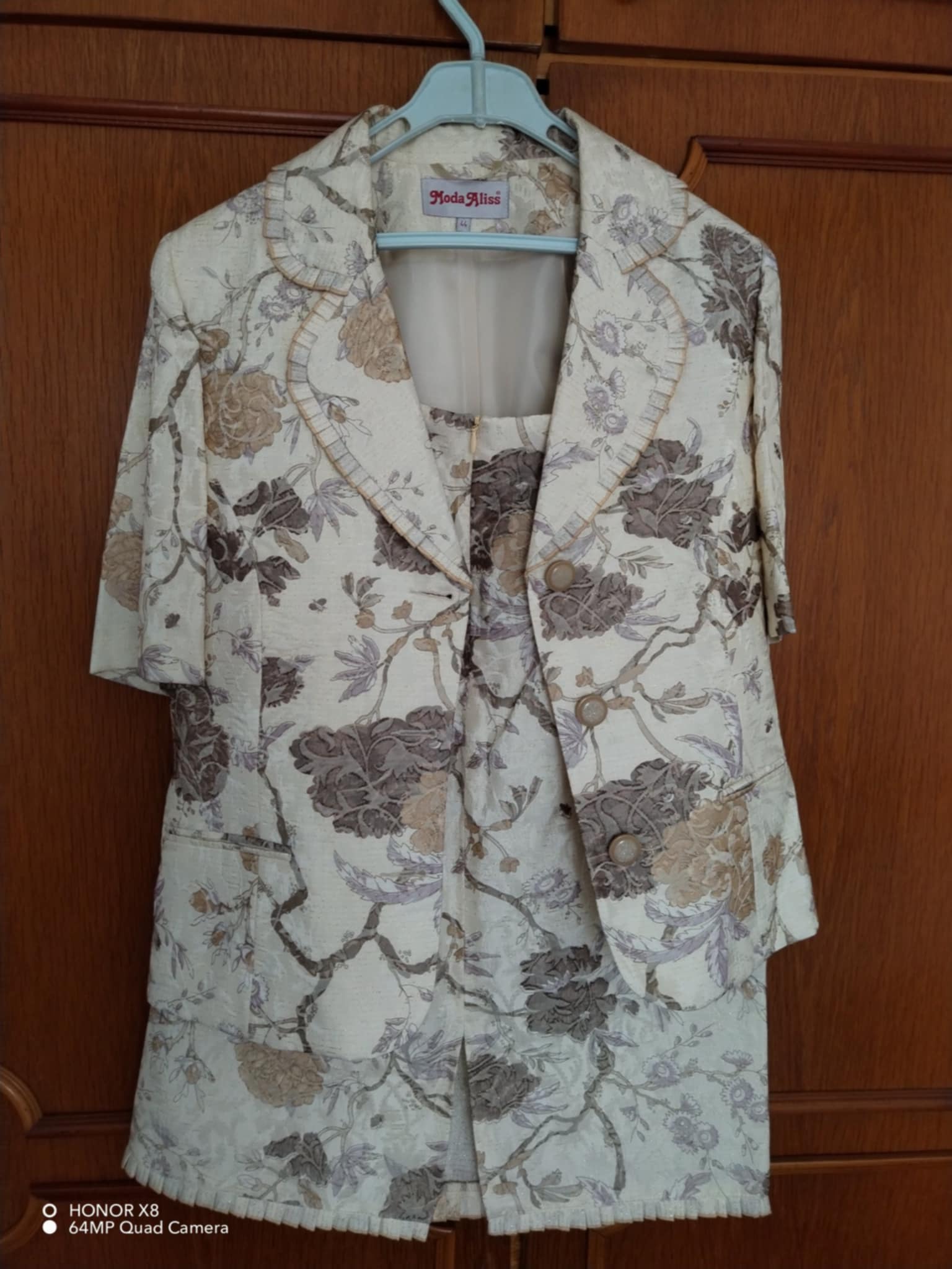 Costumul pentru damă nou, format din sacou și fustă, este disponibil în mărimea 44 și culoarea bej cu model. Potrivit pentru persoanele care poartă mărimea 44/L, Material calitati