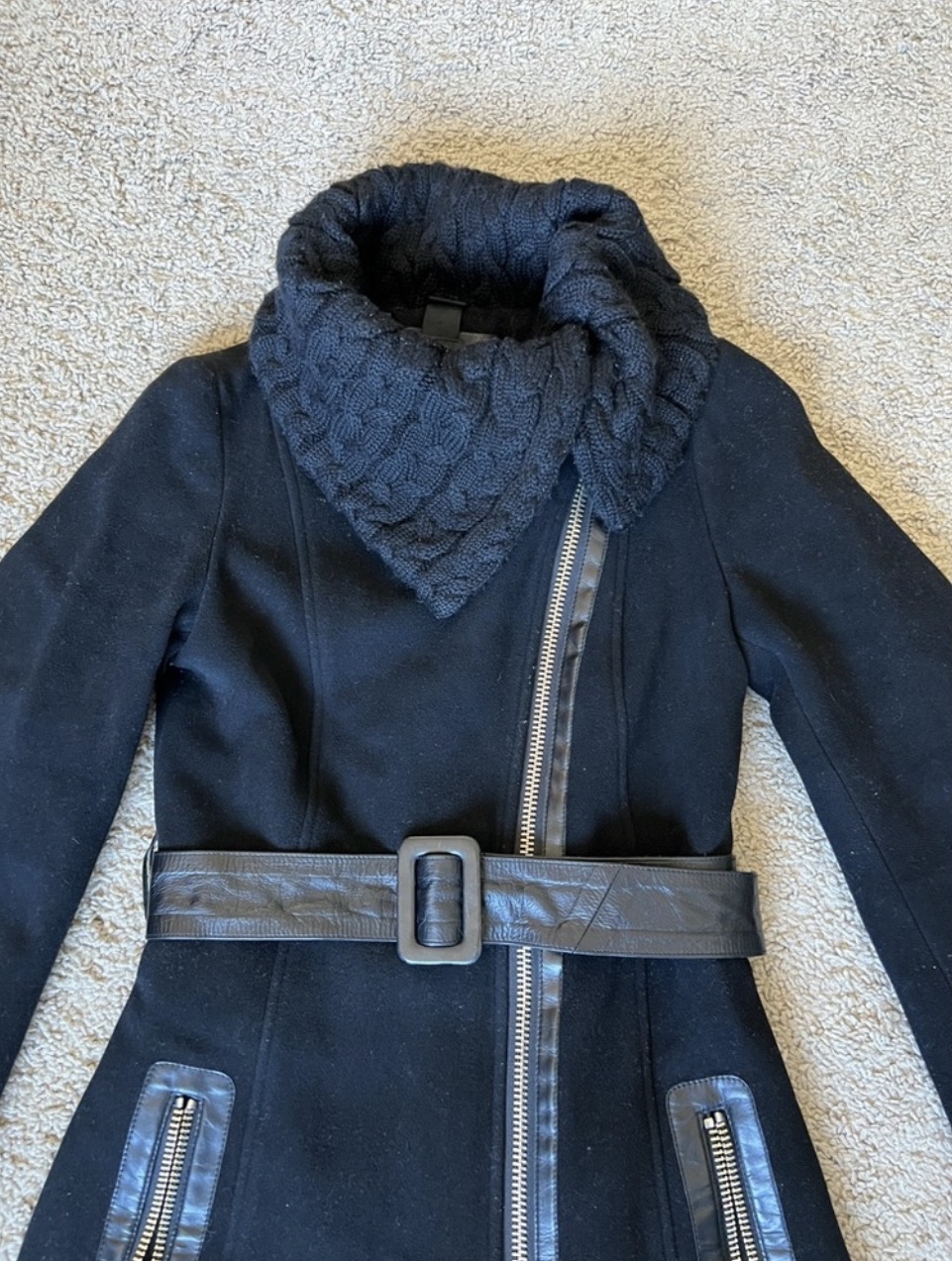 Mackage wool coat, leather trim, knit collar, bell sleeves.