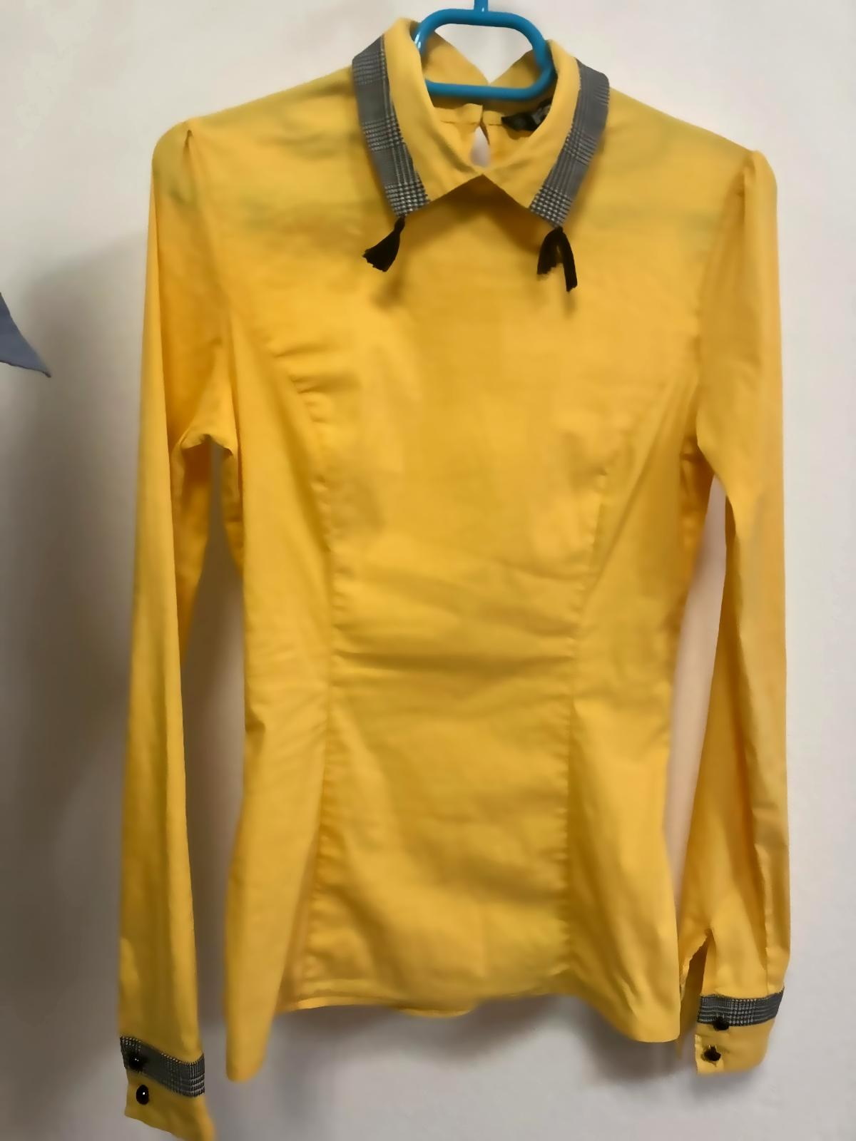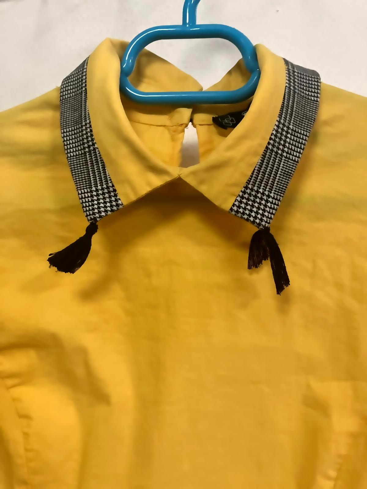 Camasa marime S, dar se potriveste la un XS sau S mai mic. Culoare galben intens, foarte frumoasa. Material subtire, usor elastic. Guler cu aplicatii franjuri negri, nasturi negri decorativi la spate si la maneci.